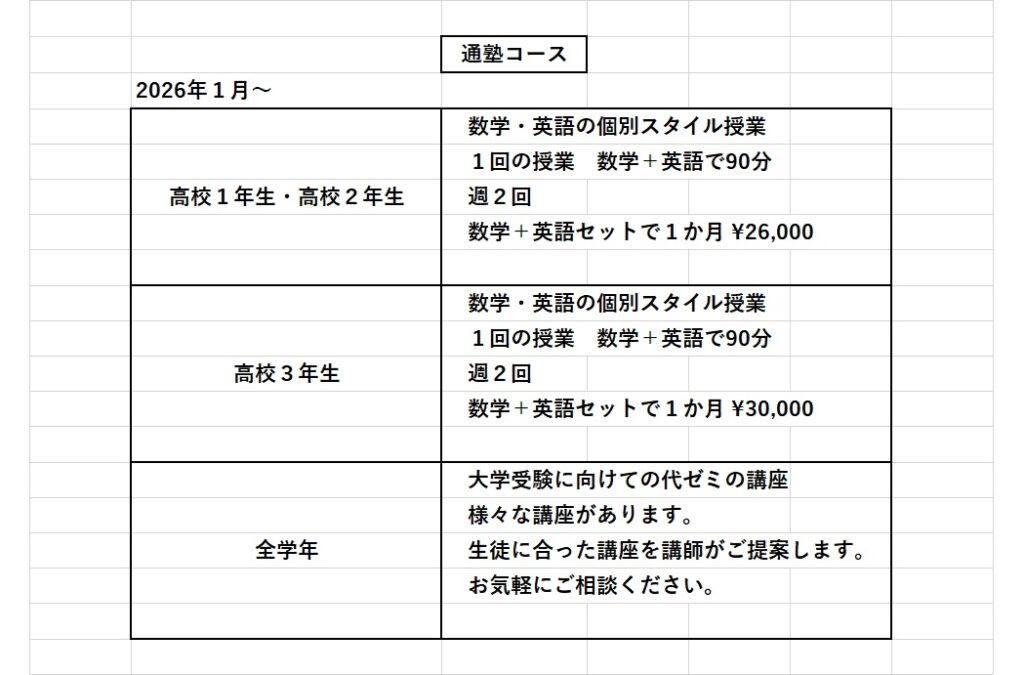 また、数学の問題演習授業では、1回の授業は、1回1時間程度、週2回の通塾で効果が出ています。